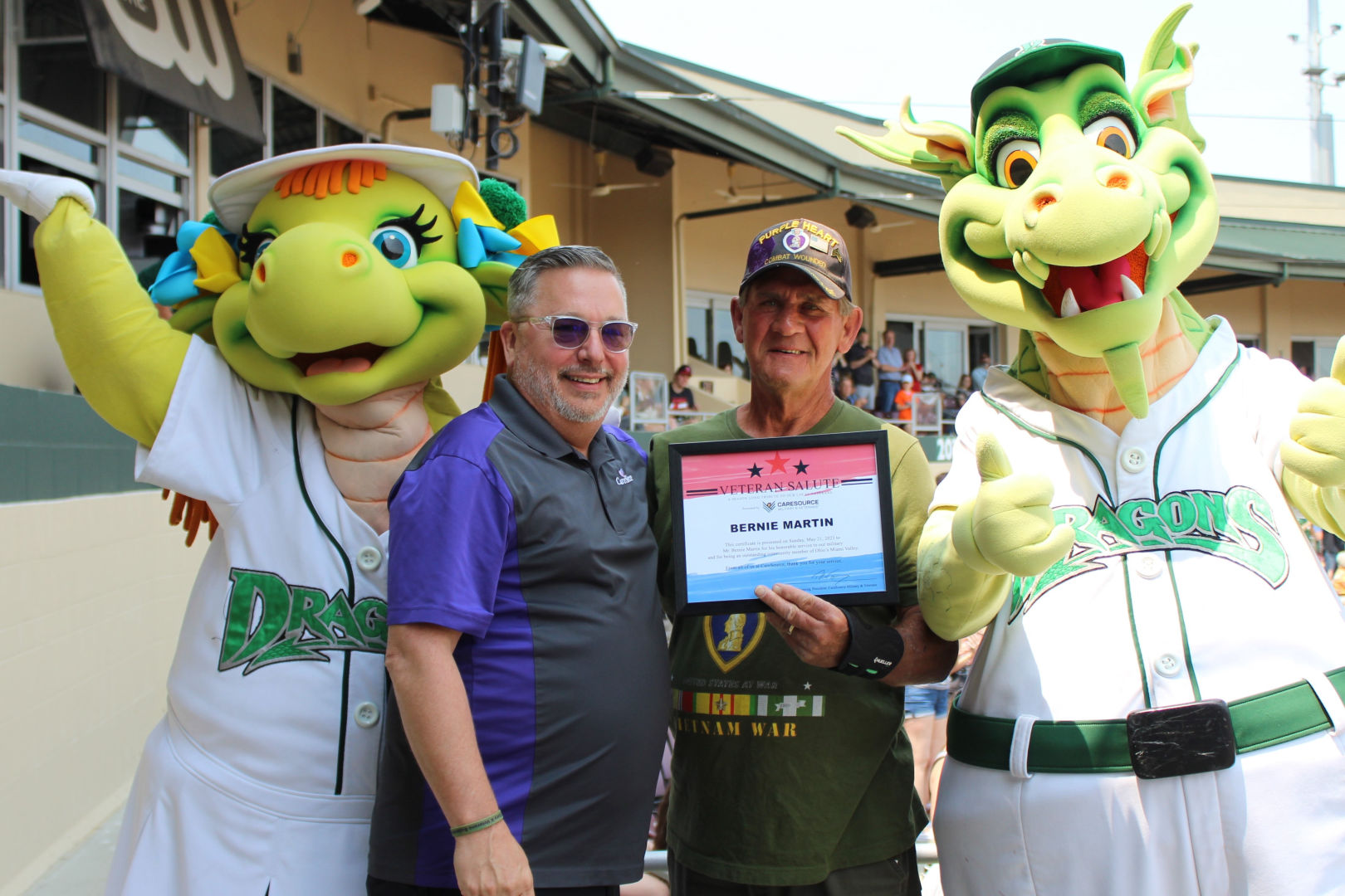 The Dragons Veteran Salute program highlighted five veterans' stories during the season. Selected veterans were recognized at multiple Dragons games with an in-game video board moment and provided with VIP treatment when they attended the Dragons game. This season, the Dragons recognized Bernie Martin (Army), William Schultz (Air Force), Ray Snedegar (Air Force), Nick Freisthler (Marine Corps.), and Teresa Bruner (Navy).